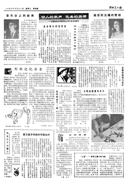 陕西工人报第4版 音乐会上的新秀 业余歌坛的佼佼者 民族风格赢得了观众 她受到吕骥的赞扬 形状记忆合金 谁说我不重用知识分子 科学园地 金属的腐蚀与防护 灰火色的白金子——钼 太阳的能量有多少 图片新闻 鸭蛋籽可治瘊子 要注意牙周病的早期治疗 法国梧桐 “人鸟”——世界上最小的飞机