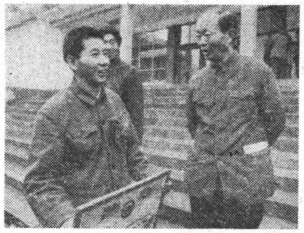 林季周副省长(右)赞扬师约记具有工人阶级的大无畏英雄主义气概,勉励他在两个文明建设中做出更大成绩。 龙吼摄