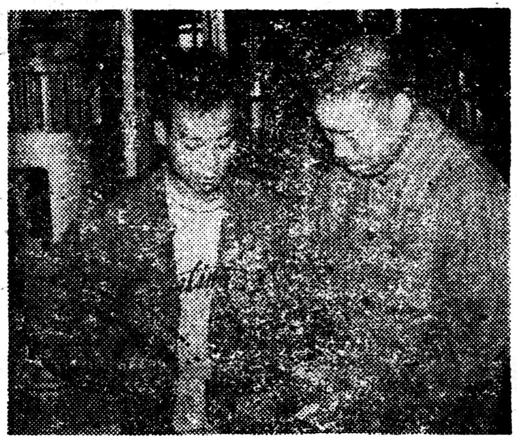 西安油漆总厂工人王守忠(右),三十多年来,刻苦钻研酚醛清漆的生产工艺,为提高产品质量做出了贡献,最近受到晋升一级工资的奖励。