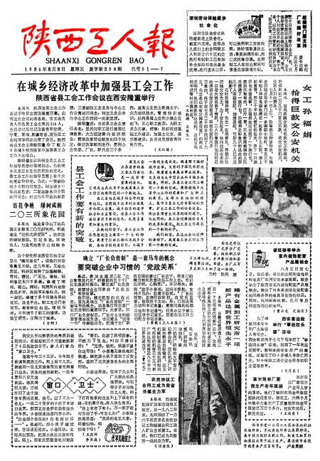 陕西工人报头版 破除崇洋思想 敢于拼搏创新 每月发布女职工最佳十件事 陕棉十厂有十六支足球队 图片新闻 党支部书记热情支持厂长工作 澄合二矿整顿劳动纪律 重视合同制工人的业务技术培训 句话新闻 三个儿子都考上了大学 里里外外一把手 省化工安装公司一年节约电费十七万元 在危急关头