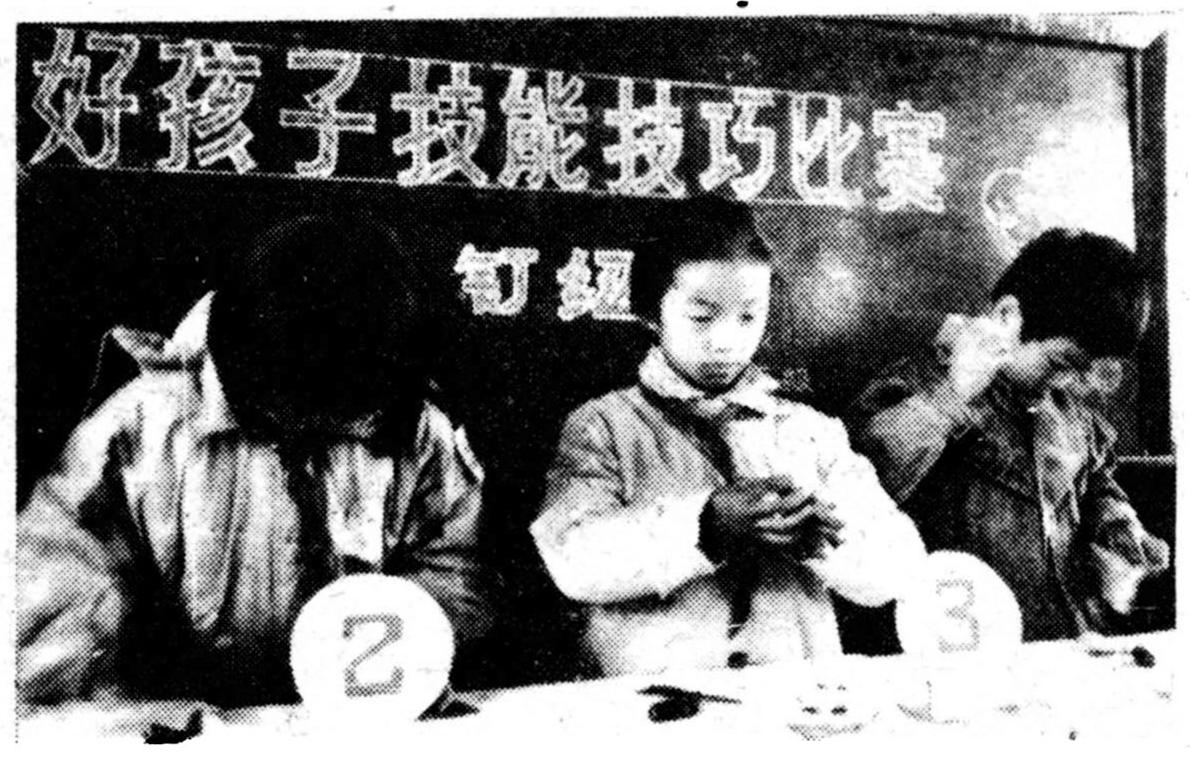 十二月五日,西安市莲湖区环城西路小学开展了“好孩子技能技巧比赛”活动,有洗手绢、钉纽扣、包饺子等六项内容。这是该校针对独生子女生活能力差的弱点,为培养孩子劳动观念开展的活动。