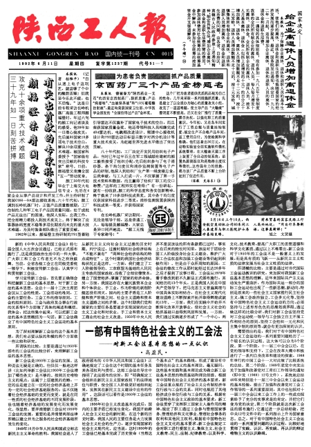 陕西工人报头版 省劳模、先进集体代表大会将于七月三日召开 富厂里的穷厂长 改革越深入越要坚定依靠职工群众 我省在上海证券交易所取得席位 工资改革出奇迹人员减少70% 一月干了仨月活 省工行大笔投贷帮粮食系统清欠“三角债” 农民兄弟的福音多元素肥精投产 原来如此 三峡胜景将永留人间 河北定州的科举考棚 彬县出土五代珍贵的墓壁浮雕 黄土高原山顶是大沙滩
