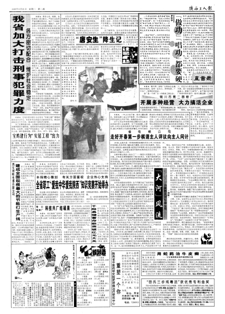 陕西工人报第2版 我省加大打击刑事犯罪力度 “唐安生”降生记 “做功”“唱功”都要硬 图片新闻 宝鸡建行为“安居工程”出力 开展多种经营  大力搞活企业 走好开春第一步棋请主人评议向主人问计 建成全国规模最大的节能灯生产线 全省职工“爱我中华爱我陕西”知识竞赛开始举办 海红轴承厂科技兴厂结硕果 千阳县储蓄存款突破亿元大关 “大河”风流 图片新闻 简讯 广告 广告 广告