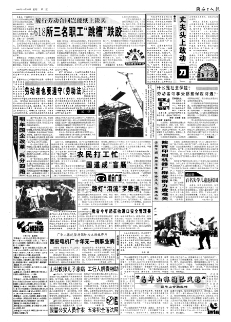 陕西工人报第2版 618所三名职工“跳槽”跌跤 丈夫不头上敢动刀西滨 劳动者也要遵守《劳动法》 图片新闻 什么是社会保险?劳动者可享受哪些保险待遇? 明年国企改革“兵分四路” 农民打工忙国道成“盲肠”路灯“泪流”罗敷道 陕西印刷机器厂群力度难关 百名失学儿童返校园 图片新闻 我省今年起征收道口安全管理费 图片新闻 广告 西安电机厂十年无一例职业病 山村教师儿子患病工行人解囊相助 假冒公安人员作案五案犯全落法网 “为华山旅游添风彩”