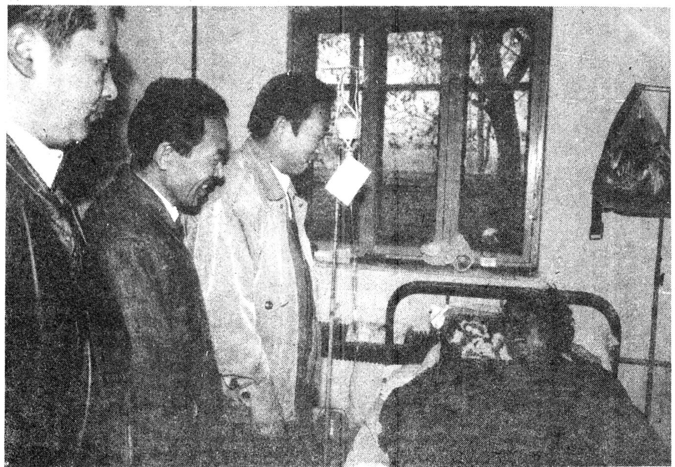 兴平陕西柴油机厂公安处干警王社教与一名持刀歹徒搏斗负伤,全厂各级领导纷纷前去医院看望,感谢他以实际行动保卫了职工家属的生命安全。图为该厂领导去医院看望王社教时的情景。