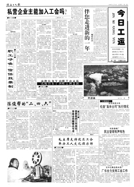 陕西工人报第3版 广告 私营企业主能加入工会吗? 伴您走进新的一年 职工呼唤“信任投票制” 沈阳有条下岗职工商业街 图片新闻 陈俊帮的“二、四、六” 图片新闻 劳动合同期限内可否变更我的工作岗位? 毛主席支持边区工会举办工人文化俱乐部 检查“集体合同”执行情况 民主管理有声有色 厂长全力支持工会工作