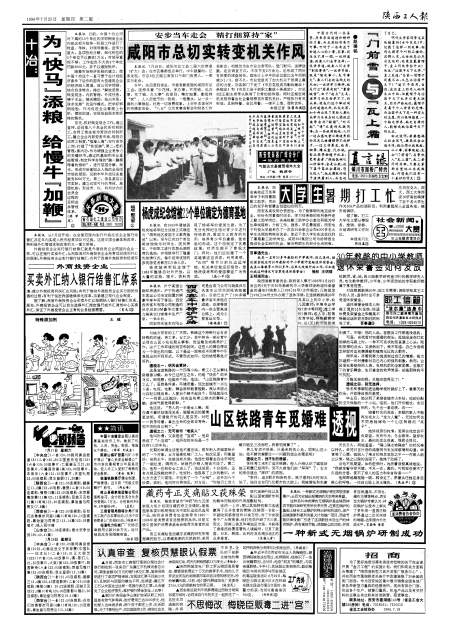陕西工人报第2版 为“快马”添粮给慢牛“加鞭” 咸阳市总切实转变机关作风 图片新闻 “门前雪”与“瓦上霜” 大学生暑期打工忙 买卖外汇纳入银行结售汇体系 杨虎城纪念馆被22个单位确定为德育基地 西安客车中标沪宁路 30年教龄的中小学教师退休荣誉金如何发放 图片新闻 山区铁路青年觅婚难透视 广告 简讯 藏药奇正炎痛贴又获殊荣 一种新式无烟锅炉研制成功 认真审查复核员慧眼认假票 不思悔改梅晓臣贩毒二进“宫” 广告