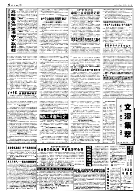 陕西工人报第3版 图片新闻 变味服务严重损害企业利益 破产企业留守人员可否“救济” 中国企业家亟需培育 我国医疗体制改革的五大任务 《老年人权益保障法》十月起施行 警惕社会服务承诺变味 广州怪事:坐着奔驰领救济 保护民族工业不等于限制外资 政府织造一道“安全网” 民族工业路在何方? 广告