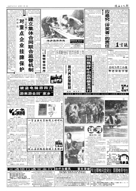 陕西工人报第2版 兴平市对重点企业挂牌保护 华山机械厂建立集体合同联合监督机制 老劳模新奉献 应追究“评奖者”的责任 西宝高速路整顿客运秩序 东桐峪金矿党员挂牌上岗 汉江水泥厂推行养老保险制 铜川焦坪矿出血热暴发流行 如何为员工办理养老保险手续 被盗盗电脑游四方游来游去回“家乡” 广告 一货主丢失货物遇上好司机 假公安拦路抢劫碰上真保安 在企事业报刊上 过河 广告