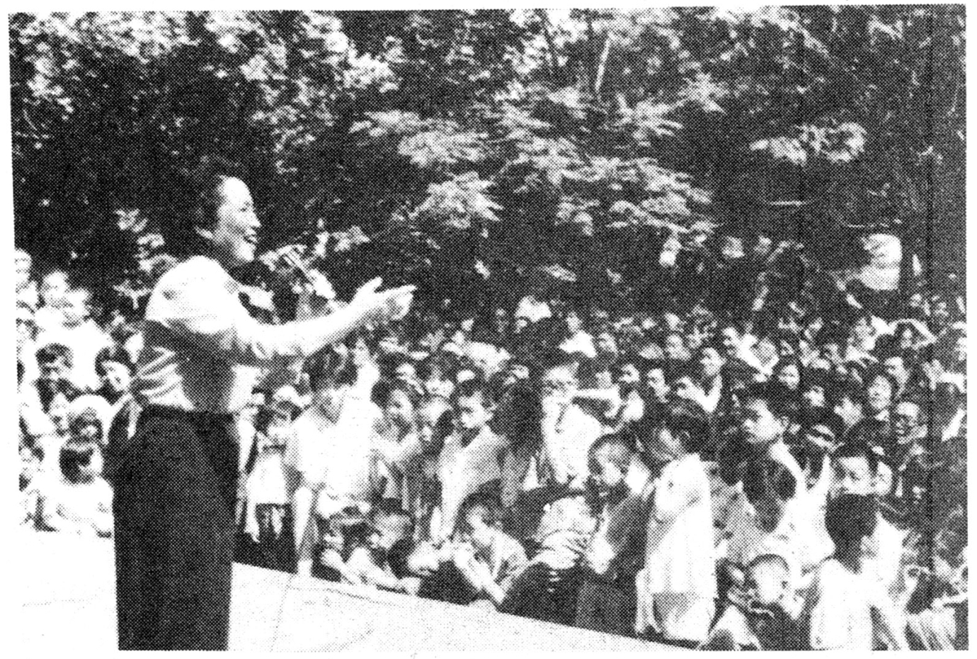 5月18日、著名歌唱家、国家一级演员,全国劳动模范负恩凤深入蒲白矿务局为煤矿工人演唱,这是在马村煤矿为矿工和家属在烈日下热情演唱时的情景。 鲍月琴摄