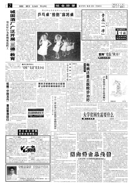 陕西工人报社会瞭望 城固酒厂广泛开展“三德”教育 乒乓桌“推倒”麻将桌 图片新闻 贵在“一律” 鬣羚“光临”陕开厂 “劳模”“先进”优先分房 首 部 国 产 大 片《鸦片战争》即将公映 有病还是去医院诊治好 句阳:严禁党员干部公款进舞厅 图片新闻 纸雕“中国龙舟”喜迎香港回归 残疾子弟高校毕业分配难矿山母亲热情接纳好儿女 老工会王清泉发挥余热育新人 《千古一爱》跻身文化部首届文学精品拍卖会 大学贫困生需要什么 广告 广告 洒向讲台纵关情