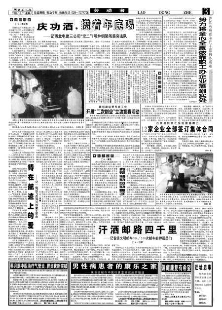 陕西工人报劳动者 庆功酒,攒着年底喝 努力将全心全意依靠职工办企业落到实处 图片新闻 他山之石 开展“二次创业”立功竞赛活动 12家企业全部签订集体合同 铸在航迹上的爱 我是制动员的妻子 图片新闻 汗洒邮路四千里 广告 广告 广告