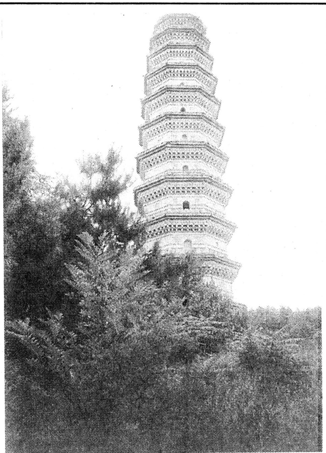 图为富县直罗镇柏山上的柏山寺塔,最早建于唐代。这里原是柏山寺所在地,塔也为寺院所属。塔身为砖砌。平面呈八边八角,每边长3.7米,直径9.1米。塔高43.3米,分为十一层。塔身外每层均饰有唐宋门窗斗拱。有的门又作小龛,内置各种人物像石雕,是唐宋时代汉族及少数民族的作品。