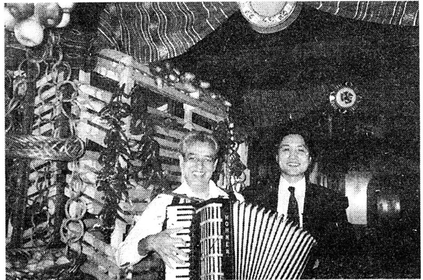 走进餐厅,一派花园景色,首先看到的是门字式的酒架,非常大,里面放满了各种地产的干、白葡萄酒。餐桌被真假花草、树木隔开,两边留出两个过道,前方哗哗的流水声发自两座假山式的喷泉。两座喷泉流水之间是一个表演式舞台,在舞台对面的餐厅那头是吧台和明档沙拉台,厨师现场制做新鲜沙拉,顾客可以亲眼看到。落座之后,服务员送上菜单,菜单是一个像册,每道菜的图片配以罗文的菜名,让人看了以后对菜一目了然。我们根据图片点了几道菜。在等菜期间先上来的是一盘按人数给的鲜尖椒,尖椒的把是用锡纸包过,以便人手去拿,辣椒是用来蘸盐配面包吃的,这倒象中餐给客人上的开胃小菜。据说罗餐的特点是酸、辣,倒挺像陕西人的口味。接着上的一道菜是烤鸡,鸡插在一个特制的叉上,下边配炸薯条和生菜,以西红柿装饰,盘子是一木旋的圆盘,圆盘的边还放了一碗点燃的酒精,以增加气氛。我们正愁怎么去吃,服务员过来熟练地把鸡分成几块,又把分好的鸡插在叉上。吃到嘴里感觉和我们的香酥鸡挺像。另一个菜也是用木制品盛的鸡、牛、猪扒配炸土豆条,最后上来的是一碗主食就象我们的稠小米饭,我们开玩笑说,这挺像陕西的乡土宴吗。陕西和罗马尼亚在饮食上有什么联系,我没有进行过考证,可能是一种巧合吧?环顾四周,客人已经坐满,餐桌上有很多增加气氛点燃酒精的菜品,甚是好看。这时音乐响起,从两边过道上来两队艺人,伴随着欢快的乐曲,走上舞台,演唱表演的全是民族歌舞,其中以表现当地人生活中的一些小品式歌舞更引人注目,有理发、结婚、厨师做菜等,正在欣赏,同桌的刘华被拉上舞台来参与表演理发、刮胡子。用真的肥皂沫、刷子、刀、一整套理发程序的熟练操作,最后以“客人”非常满意而结束。我正在鼓掌,一场结婚又开始了,我被邀上台和其它一些顾客一同参加“婚礼”手拉手在餐厅转圈。我们沉浸在欢乐的结婚喜庆之中……?