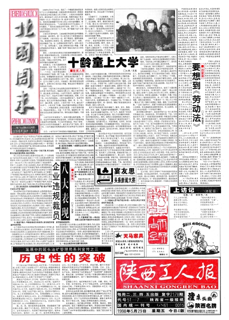 陕西工人报头版 高度重视 加强领导齐心协力 做好工作 图片新闻 一专多能好洒脱 广告 铁一院昼夜兼程赶绘蓝图 广告 下岗不离厂就地办猪场 天然气快步进入咸阳千家万户 朝阳煤矿属私营性质企业 图片新闻 巨资投家乡回报众父老 广告 未央区因企制宜抓改制 学邯钢成果不凡 小水电托起岚皋经济