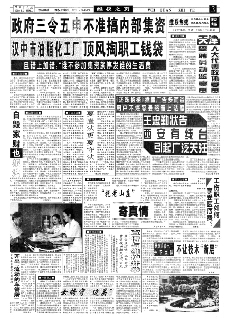 陕西工人报维权之页 政府三令五申不准搞内部集资汉中市脂化工厂顶风掏职工钱袋 广告 天津人大代表政协委员受聘劳动监察员 自毁家财也犯法 要懂法更要守法 王忠勤状告西安有线台引起广泛关注 图片新闻 “托老山庄”寄真情 工伤职工如何享受医疗费? 开出“流动的车管所” 金台区消协上半年为消费者挽回损失近20万元 长庆采油一厂井下大队不让技术“断层” 女将守“边关” 图片新闻