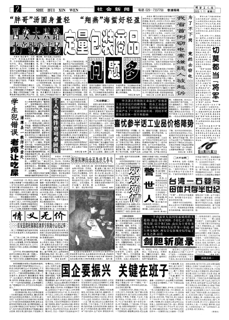陕西工人报社会新闻 西安大兴路水产批发市场定量包装商品问题多 我省首例窃电案嫌疑人被起诉 切莫都当“将军” 学生犯错误老师让吃屎 个人发邮件也可哪回执 喜忧参半话工业品价格降势 西安车辆段全面整修迎春运 双双殉情警世人 台湾一石婴与母体共存半世纪 情义无价 图片新闻 剑胆斩魔录 国企要振兴关键在班子