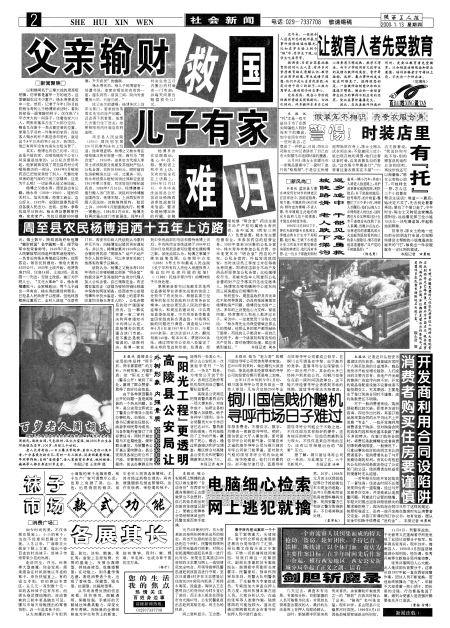 陕西工人报社会新闻 父亲输财救国儿子有家难归 让教育人者先受教育 警惕!时装店里有“托” 坡陡路滑 老人跌下深沟返乡途中 干部见危勇救 图片新闻 百岁老人周胡氏 高陵县公安局让“阳光工程”更透明 铜川国信贱价赠机寻呼市场日子难过 并发商利用合同设陷阱消费者购买住房要谨慎 袜子市场款式功能各展其长 广告 电脑细心检索网上逃犯就擒 剑胆斩魔录