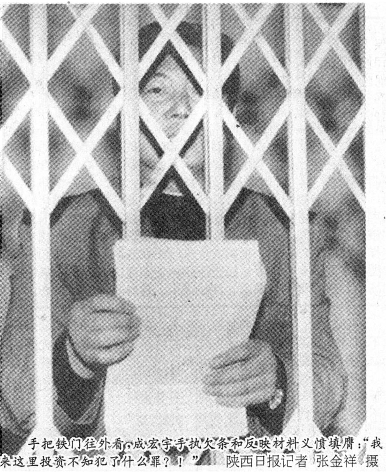 四处奔走呼救的成妻,望着走出铁门的丈夫、前来采访的记者和市府官员,泣不成声地呼喊:“我们夫妻响应政府号召来咸阳周陵投资办企业,不知都犯了什么罪,落得了鸡犬不宁的下场”。
