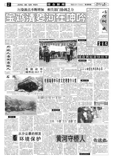 陕西工人报综合新闻 宝鸡清姜河在呻吟 以何树“威” 外地人告倒当地人 我国设市城市达663个 图片新闻 捕食青蛙者快住手 小储蓄怎样存取合算 石阵 校园墙报中不良文化现象令人忧 西安灞桥农民不随“份子”随“股份” 吉林:“牛鞭”充作“鹿鞭”卖 施工重地演闹剧 警方出手平事端 图片新闻 从沙尘暴的频发看环境保护 黄河守桥人 告读者