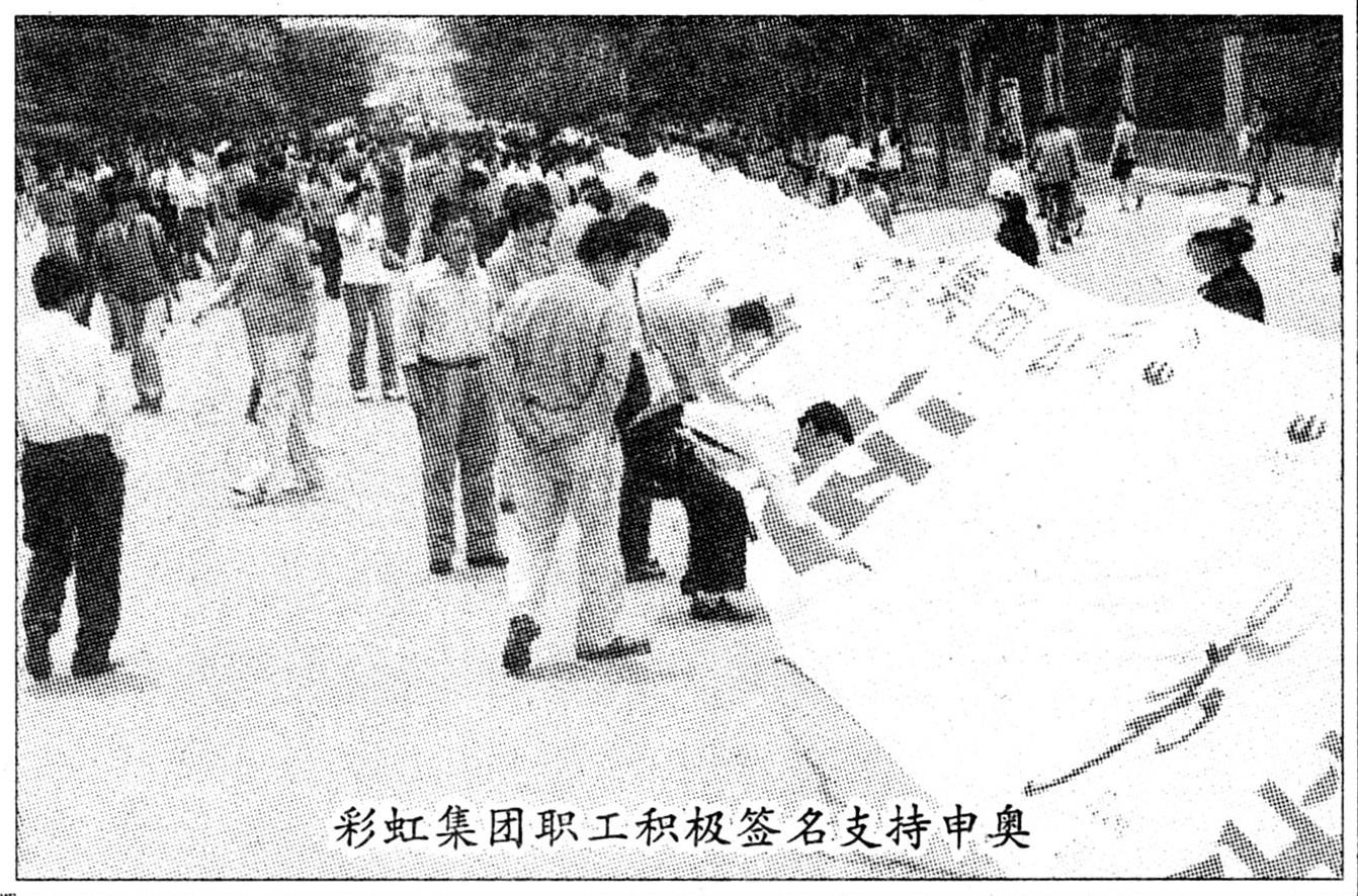 申奥成功是每一个中华儿女的愿望,彩虹人为将这美好愿望表达出来,特意制作横幅为100米长、2.008米宽,喻意着北京2008年申奥百分之百成功。5月18日中午,在公司大门前举办了“彩虹集团公司万名彩虹人支持申奥运签名活动启动仪式”,集团公司党委书记、副总经理陶魁致辞,集团公司总经理马金泉带头在横幅上签字。十三个基层工会和子校、离退办也都分别举办了签名活动,都搞了各自的签名仪式,仪式上单位领导讲话并带头签名,群众踊跃参加,场面十分热烈。