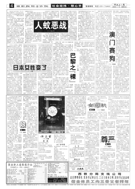 陕西工人报北国周末-社会经纬·憩心亭 人蚊恶战 日本女性变了 巴黎之“裸” 澳门赛狗 娘 图片新闻 女司机 诗二首 大写 借钱之后 广告 尊严 广告