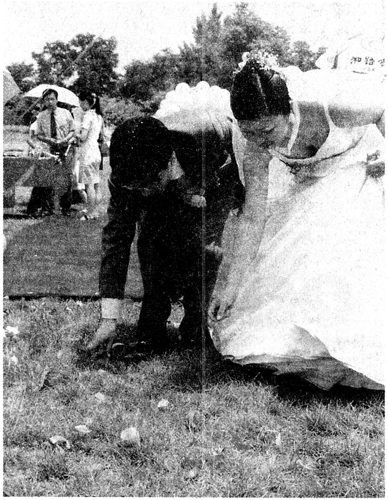 婚礼过后,新人段博、刘喜梅双双捡拾草坪上散落的彩条、纸屑,给所有来宾留下了深刻的印象。