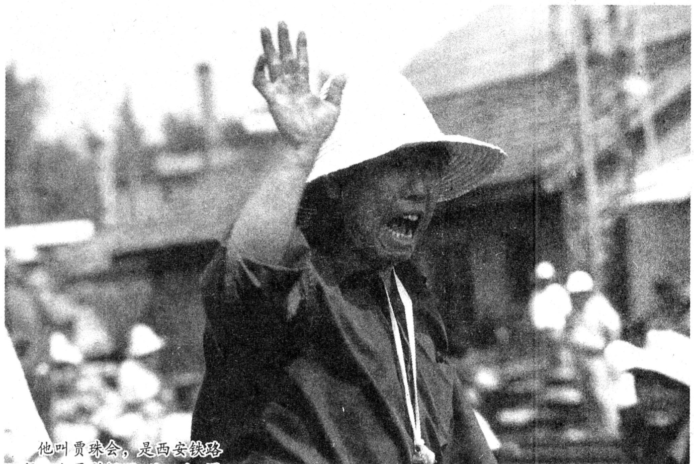 他叫贾珠会,是西安铁路工程一公司副经理。从工人、团支部书记、党支部书记、纪委书记到指挥长;从宝天线、宝成线到西宝提速转线,都有他的身影。几年来他多次被上级评为先进工作者、优秀共产党员。他喊起号子来声音宏亮,响彻工地。职工们说:“喊号子还是得贾经理。”图为贾珠会在虢镇车站转线时喊着号子指挥施工。