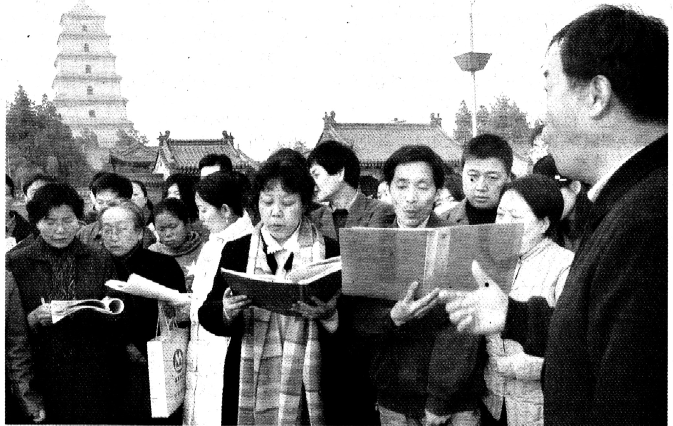 每逢周日下午,西安大雁塔南广场歌声显得格外嘹亮,《红军不怕远征难》、《祖国颂》、《走过新时代》老歌新歌一首紧接一首,唱者动情,听者动容,掌声阵阵。这是一支由退休人员组成的合唱团,合唱团现有成员100多人,还不断有新人加入,问起合唱团的名字,有的说叫“广场合唱团”、有的说叫“老百姓合唱团”,歌声成了大雁塔南广场的新景观。魏永贤摄