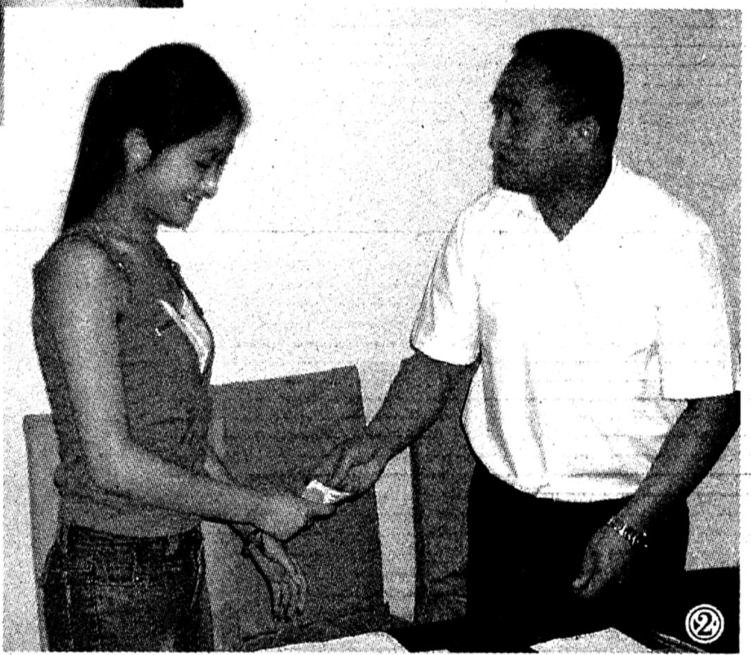 图二猴王汽车服务有限公司总经理侯晓军向刘莹同学现场捐助1000元。 本报记者 章琦 文/图