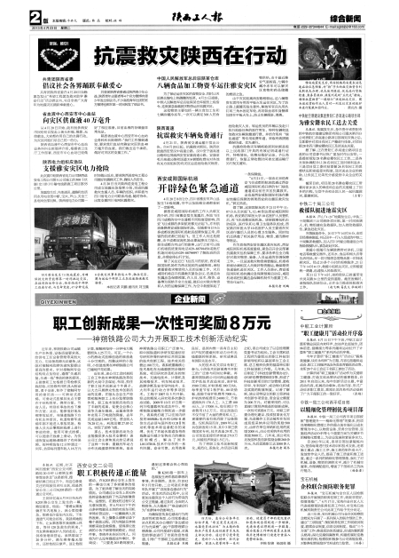 陕西工人报综合新闻 抗震救灾陕西在行动 图片新闻 为雅安籍农民工送去关爱 救援队挺进地震灾区 职工创新成果一次性可奖励8万元 职工积极传递正能量 图片新闻 “职工健康月”活动拉开序幕 以精细化管理创优秀项目部 企检联合预防职务犯罪