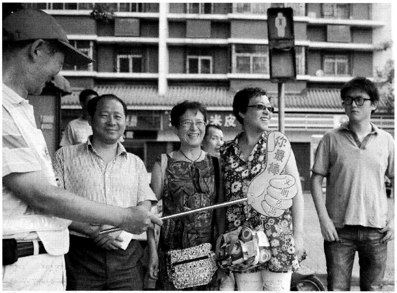 7月10日,在西安洒金桥十字路口,文明引导员给耐心等待红灯的市民竖起赞赏的“大拇指”。当日,为了赞扬市民们的文明行为,引领文明风尚,西安市莲湖区推出“伸出大拇指文明新莲湖”主题活动。公共文明引导员们用印有“你最棒”等鼓励语的大拇指指示牌和引导旗在十字路口引导市民,希望鼓励他们在日常生活中养成文明礼让、遵守交通规则的好习惯。 刘潇 摄