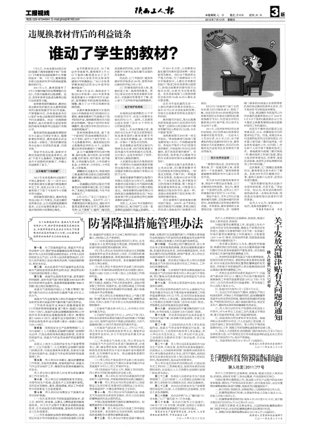 陕西工人报工报视线 谁动了学生的教材? 防暑降温措施管理办法 关于发放高温津贴有关问题的通知 关于调整陕西省夏季防暑降温费标准的通知