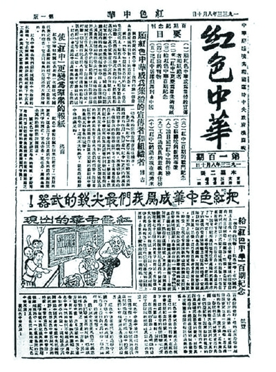 中央苏区机关报《红色中华》刊影,图片展示的是第一百期头版。