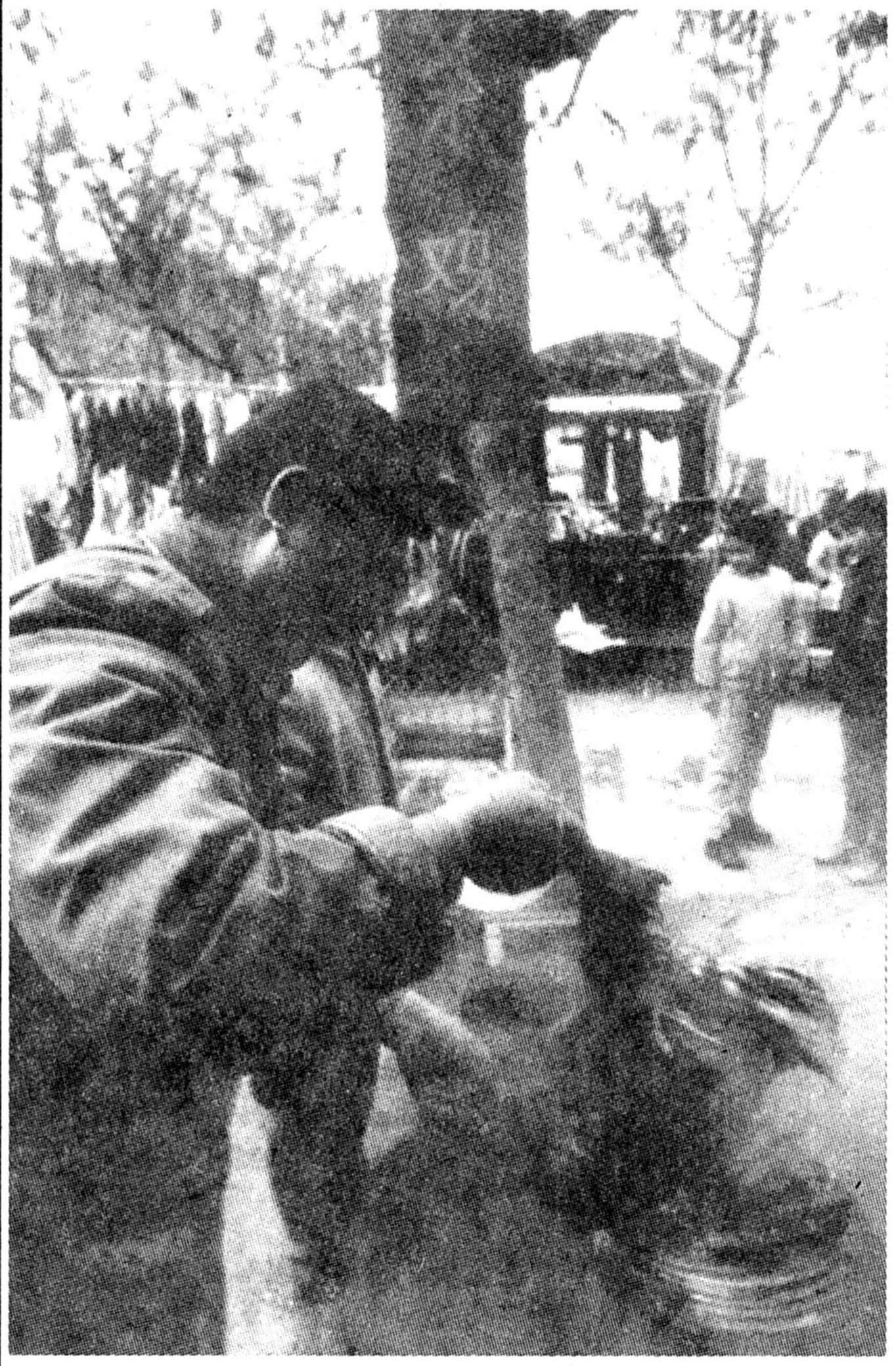 春节前夕,商品销售进入高潮。一些商贩抓住这一时机,想尽办法促销。瞧,这位经销鸡的小贩现卖现杀,忙得不亦乐乎,买家也为能吃个放心肉而十分心慰。 本报记者郭玉军摄