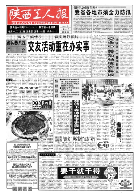 陕西工人报头版 我省各地市须全力防汛 省兵器系统工会交友活动重在办实事 『心连心』轰动杨凌农科城 点点滴滴总关情 标题新闻 图片新闻 图片新闻 韩城下茬消除安全生产隐患 西安客运段与延安五单位共建“双拥”列车 如此『活动』有何益? 西北化院化肥公司开展劳动竞赛见实效 南郑在教职工中开展师德教育测试 建行宝鸡县支行扶持重点项目发展地方经济 王顺山森林公园为劳模免费开放 要干就干得最好