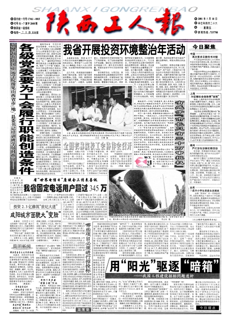 陕西工人报头版 各级党委要为工会履行职能创造条件 我省开展投资环境整治年活动 图片新闻 全国农林院校工会协作会召开 有感于“市长只有三十万审批权” 我省固定电话用户超过345万 图片新闻 中国再次要求日教科书纠错 上海为征缴社会保险费“保驾” 福州严打涉车涉路犯罪活动 台湾7成中小学生深感生活困扰 咸阳城市面貌大“变脸” 简明新闻 哪些项目必须进行招投标 用“阳光”驱逐“暗箱”
