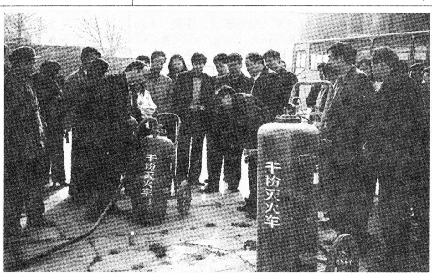 为了提高职工的安全意识和能力,确保安全经营,近日,西安市化工轻工总公司对职工普遍进行了一次安全知识教育。图为工作人员正在向职工讲解干粉灭火车的原理和操作方法。 马号学 摄