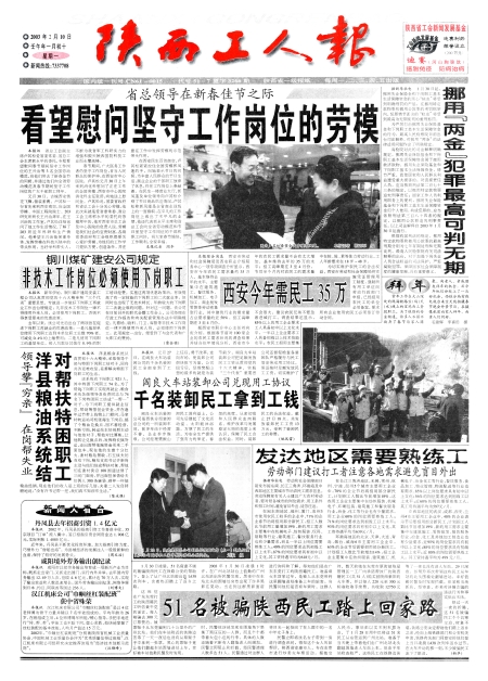 陕西工人报头版 看望慰问坚守工作岗位的劳模 挪用“两金”犯罪最高可判无期 非技术工作岗位必须使用下岗职工 西安今年需民工35万 拜年 洋县粮油系统结对帮扶特困职工 千名装卸民工拿到工钱 图片新闻 发达地区需要熟练工 新闻大看台 51名被骗陕西民工踏上回家路