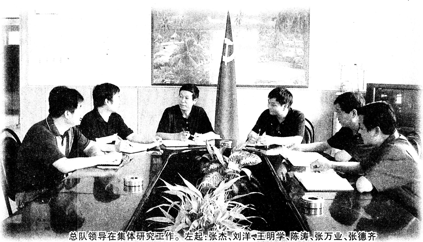 总队领导在集体研究工作。左起:张杰、刘洋、王明学、陈涛、张万业、张德齐