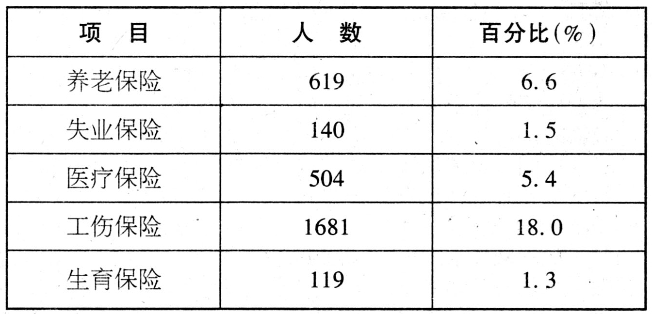 5、工伤、医疗、养老保险参保率很低,普通农民工几乎得不到基本社会保障。问卷调查农民参加五大社会保险情况如下表(总人数9344人):