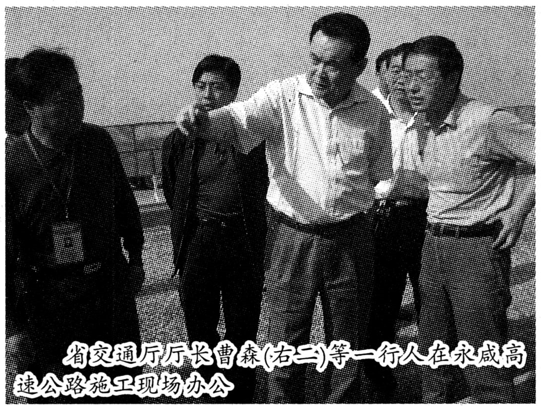 省交通厅厅长曹森(右二)等一行人在永咸高速公路施工现场办公