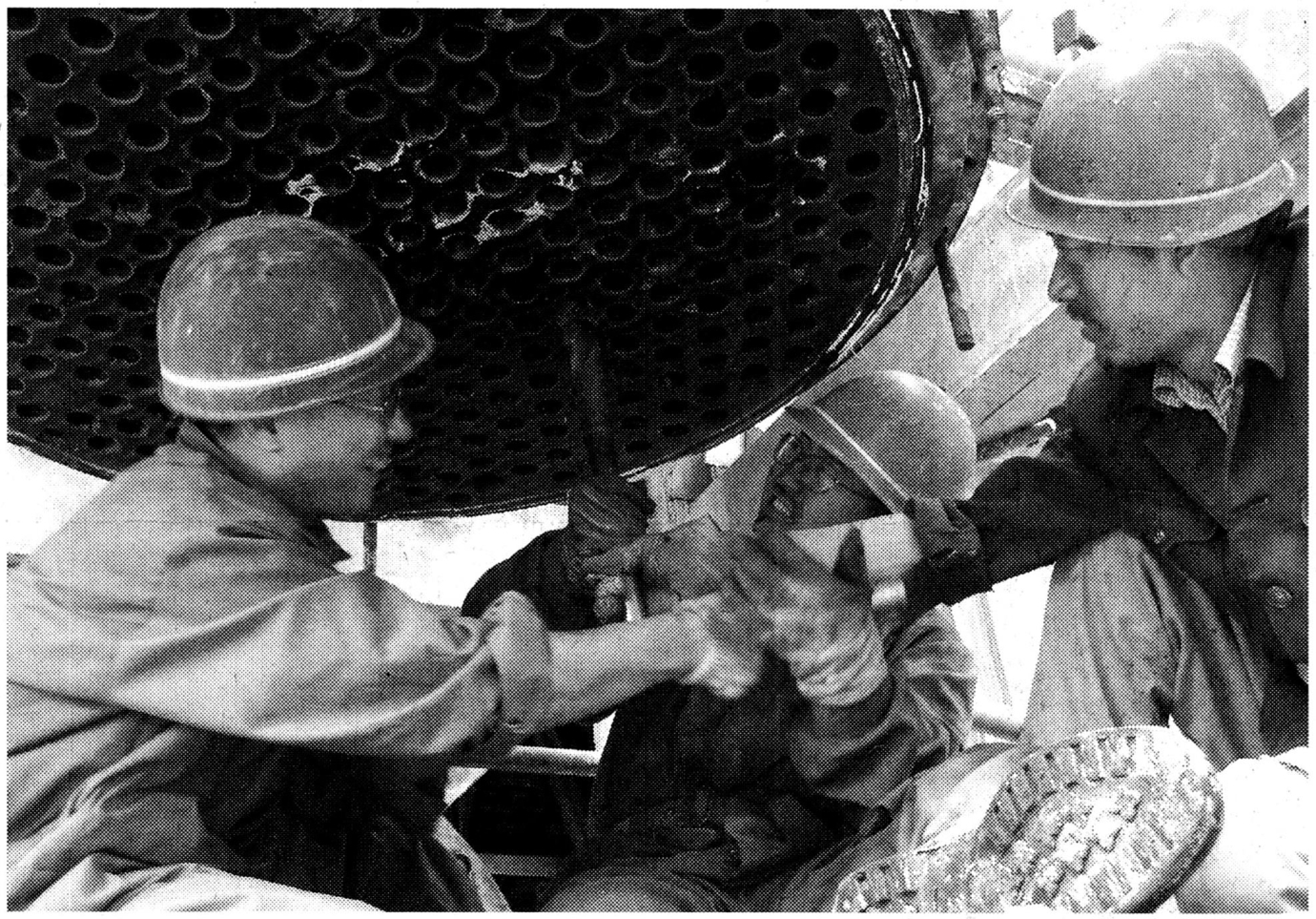 陕西华山化工集团磷酸车间坚持开展技术改造,经多次实验用镶保护套的办法解决了石墨换热器受磷酸冲刷易受磨损这个困扰企业多年的难题。此项技术改造的成功,延长了设备的使用寿命,每年为企业节省设备经费100多万元。图为技术人员进行安装保护套的扩孔工作。