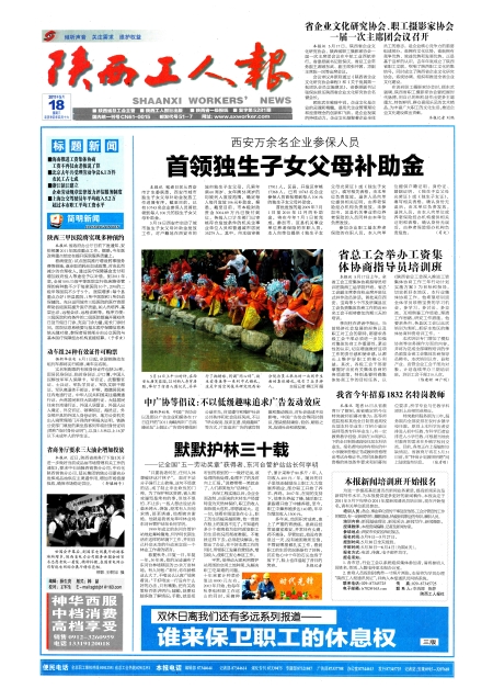 陕西工人报头版 省企业文化研究协会、职工摄影家协会一届一次主席团会议召开 标题新闻 陕西三甲医院将实现多种预约 动车组24种有效证件可购票 省商务厅要求三大油企增加投放 图片新闻 广告 谁来保卫职工的休息权 首领独生子女父母补助金 图片新闻 省总工会举办工资集体协商指导员培训班 中广协等倡议:不以低级趣味追求广告轰动效应 我省今年招募1832名特岗教师 默默护林三十载 本报新闻培训班开始报名