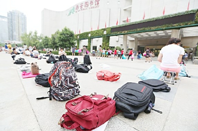 8月14日早6时,西安市图书馆外,学生用书包排起了4列长队。由于开馆时间尚早,学生们或听歌或看书,有的甚至还睡起了觉。
