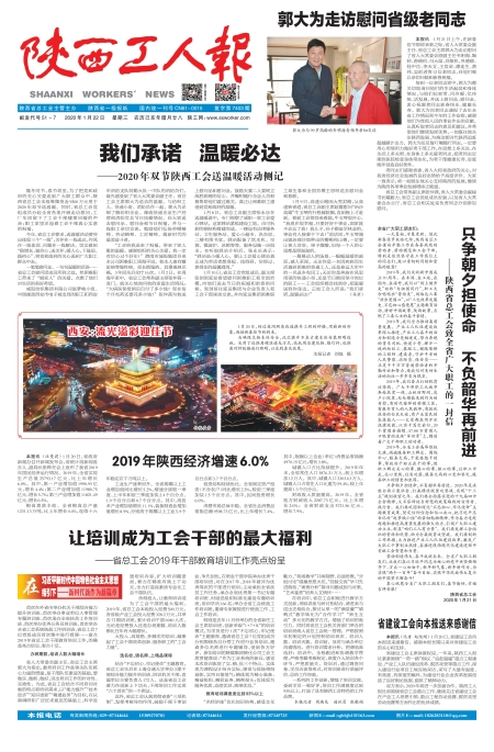 陕西工人报头版 郭大为走访慰问省级老同志 我们承诺 温暖必达 西安:流光溢彩迎佳节 只争朝夕担使命 不负韶华再前进 2019年陕西经济增速6.0% 省建设工会向本报送来感谢信 让培训成为工会干部的最大福利